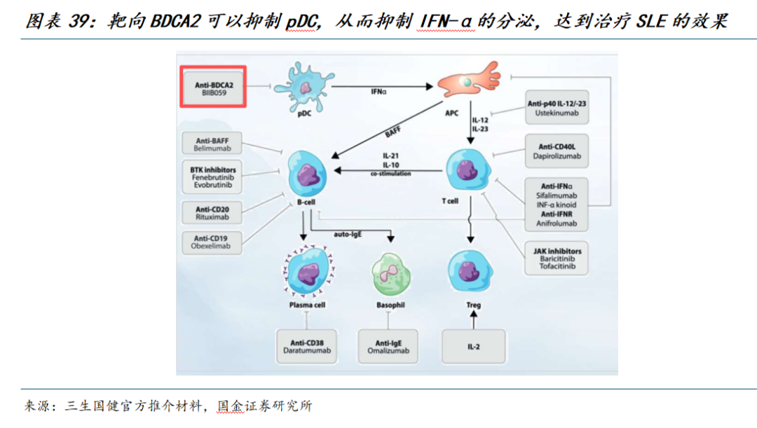 Biogen的BDCA2单抗Litifilimab 针对SLE和CLE的II期临床均展现出优异疗效,有望成为SLE新一代治疗靶点。血液树突状细胞抗原2(BDCA-2,也被命名为CLEC4C或CD303),是一种在人类浆细胞样树突状细胞(pDCs)上发现的独特II型C型凝集素受体(CLR)。目前普遍认为Ⅰ型干扰素(如干扰素-α)在SLE发病中起关键作用——患者体内Ⅰ型干扰素水平升高,且干扰素应答基因表达异常;此前已有研究证实,靶向Ⅰ型干扰素受体的抗体(如阿尼鲁单抗)对SLE有效,进一步验证了I型干扰素通路的治疗价值。BDCA2是仅表达于浆细胞样树突状细胞(pDCs)表面的受体,而 pDCs 是体内Ⅰ型干扰素的主要产生细胞,且会在 SLE 患者的皮肤病变和受累器官中聚集。鉴于pDC产生的干扰素α/β(IFNα/β)被普遍认为是SLE的主要病理生理驱动因素,BDCA2因此被视为一个有潜力阻断SLE中IFNα/β产生的治疗靶点。Biogen的BDCA2单抗在SLE和CLE中均展现出较好的疗效,且非头对头比较下,SLE适应症相较于安慰剂组主要终点指标改善的差值较其他药物提升更高,有望成为新一代治疗靶点。