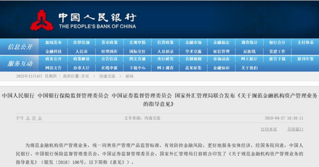 ▼《关于规范金融机构资产管理业务的指导意见》(又称“资管新规”)。图片来源:中国人民银行