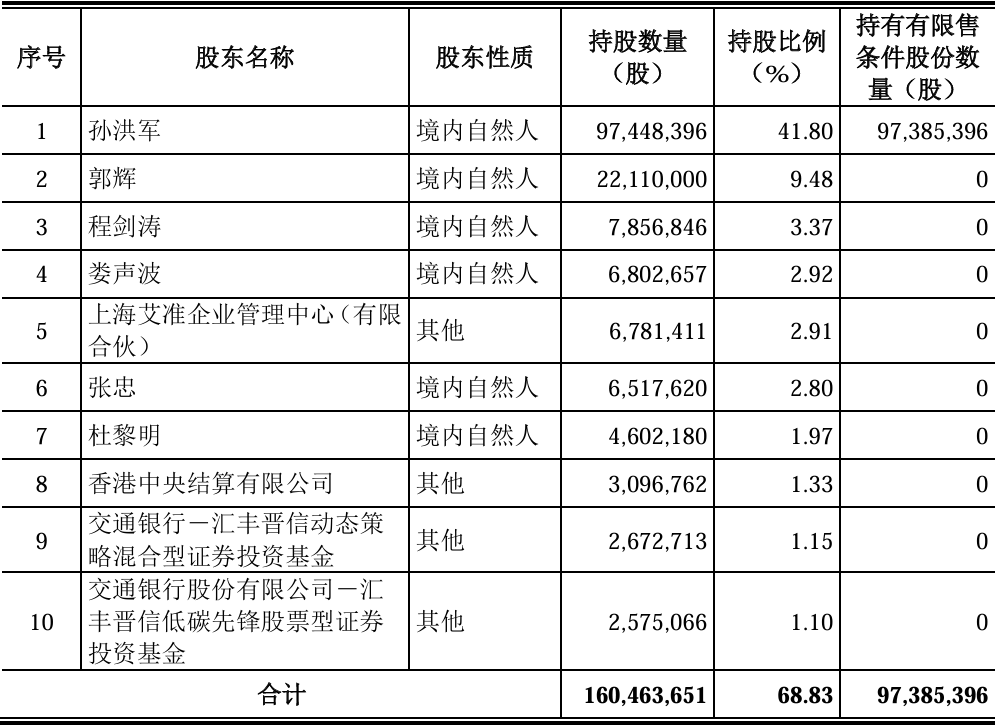 公司发行控股股东、实际控制人为孙洪军。截至2025年6月30日,孙洪军直接持有公司41.80%的股份,并通过上海艾准及上海艾准的有限合伙人上海集为间接持有公司0.01%的股份,合计持有公司41.81%的股权。