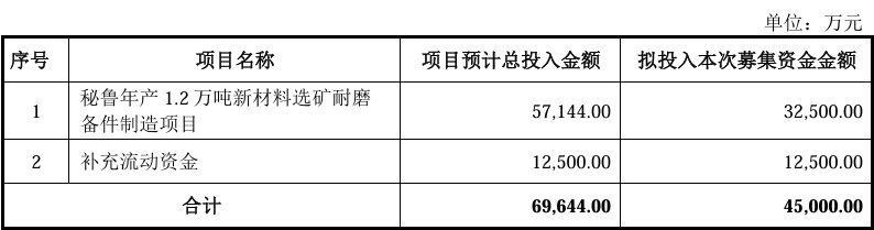 此次再融资拟募集4.5亿元,用于秘鲁年产1.2万吨新材料选矿耐磨备件制造项目、补充流动资金项目。