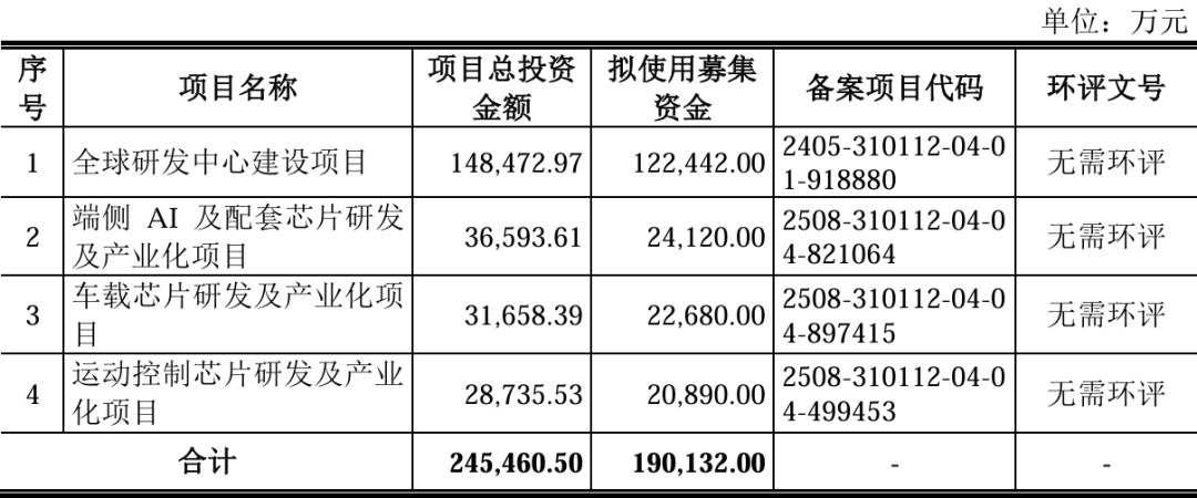 此次再融资拟募集19.01亿元,用于全球研发中心建设项目、端侧AI及配套芯片研发 及产业化项目、车载芯片研发及产业化项目、运动控制芯片研发及产业化项目。