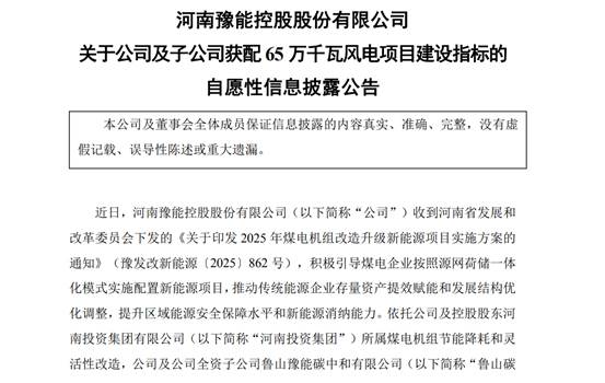 12月3日晚间,豫能控股(001896)发布公告,公司于近日收到河南省发展和改革委员会下发的《关于印发2025年煤电机组改造升级新能源项目实施方案的通知》,依托公司及控股股东河南投资集团有限公司(以下简称“河南投资集团”)所属煤电机组节能降耗和灵活性改造,公司及公司全资子公司鲁山豫能碳中和有限公司(以下简称“鲁山碳中和”)、河南豫能新能源有限公司(以下简称“豫能新能源”)共获配风电项目建设指标65万千瓦。