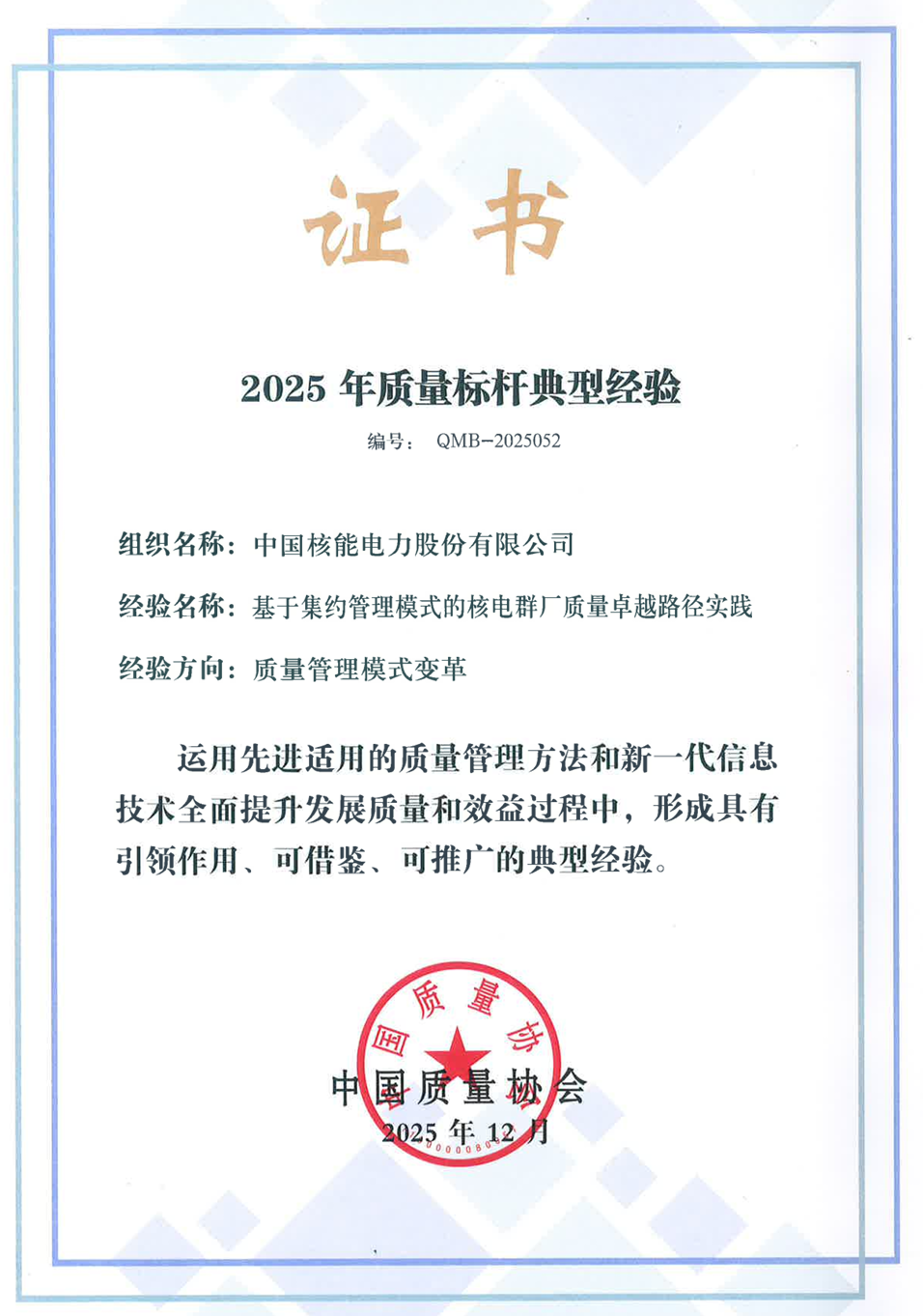 12月3日,中国核电《基于集约管理模式的核电群厂质量卓越路径实践》成功获评中国质量协会“2025年全国质量标杆”典型经验。这是中国核电本部首次荣获这一国家级质量荣誉,标志着中国核电在质量管理创新和卓越绩效实践方面达到全国领先水平。