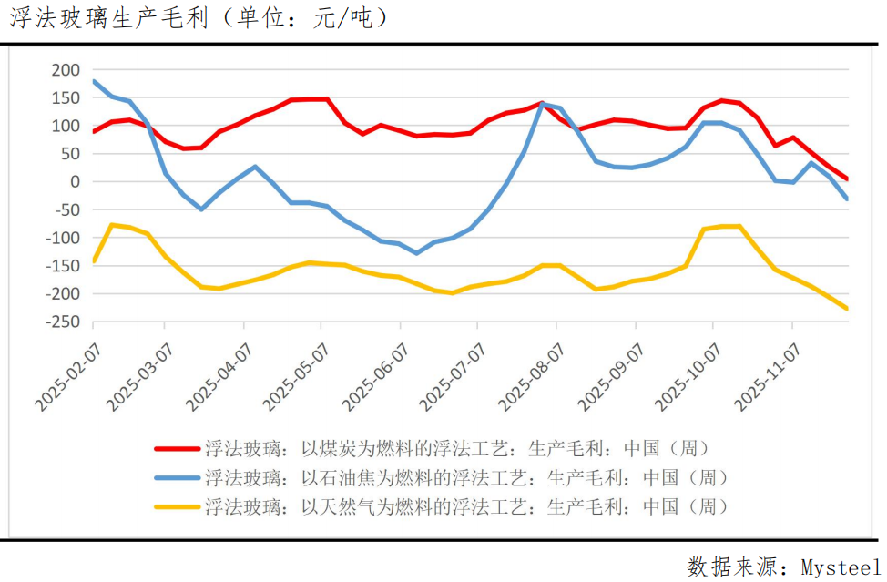 随着价格持续下行,行业利润被快速侵蚀。目前使用不同燃料的玻璃产线已普遍陷入账面亏损,特别是环保要求更高的管道天然气产线,亏损幅度较大。Mysteel数据显示,截至12月4日,以天然气为燃料的浮法工艺生产毛利为-227.27元/吨,处于深度亏损状态;而以煤炭为燃料的浮法工艺生产毛利为4.5元/吨,以石油焦为燃料的浮法工艺生产毛利为-31.48元/吨。