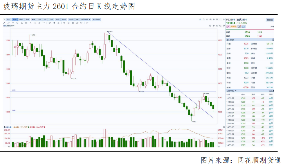 近日玻璃期货反弹承压后再度走弱,截至本周四(12月4日),主力合约日K线走出4连阴,期价再度跌回1000元/吨关键心理关口附近。那么是什么导致玻璃期价再度走弱,后市还将继续下探吗?