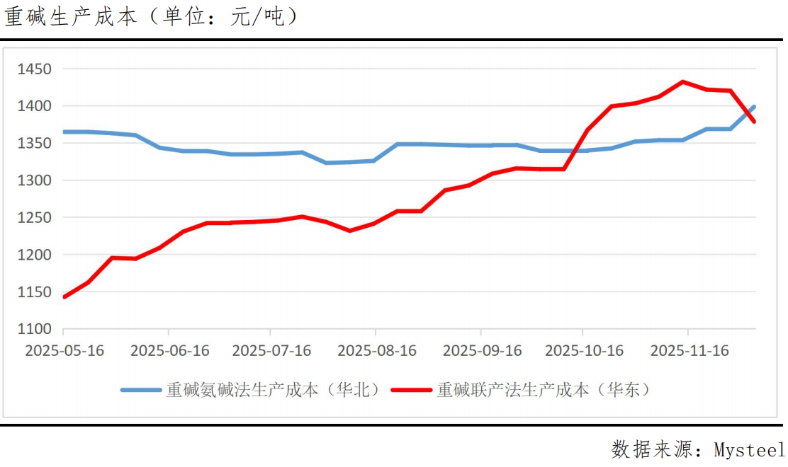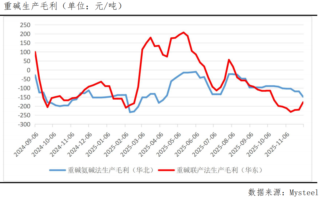 成本方面,据Mysteel数据,截至12月4日,氨碱法生产成本(华北)为1398.5元/吨,生产毛利继续下滑至-148.5元/吨;而生产占比最高的联碱法(华东)成本近期明显上扬,目前已回落至1378.5元/吨,生产毛利降小幅回升至-178.5元/吨。结合盘面来看,近期纯碱期货盘面价格持续低于主流工艺生产成本。