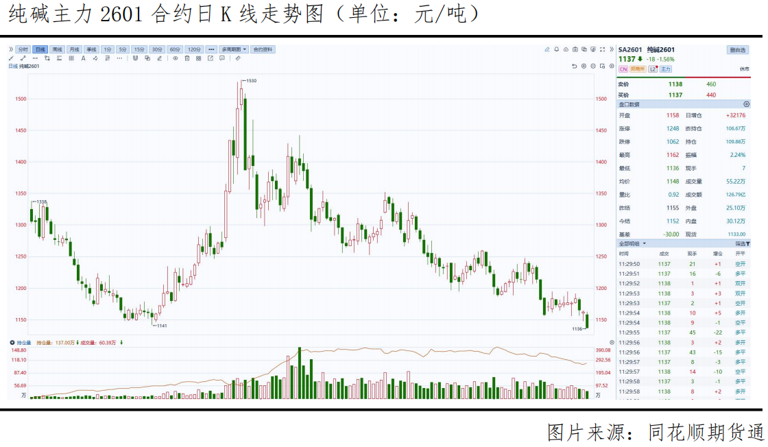 近期纯碱期货持续偏弱运行,截至今日(12月5日)上午收盘,纯碱主力合约SA2601报收1137元/吨,跌幅1.56%,创出2019年纯碱期货上市以来新低。那么是什么原因导致纯碱走势如此弱,后市将如何运行?