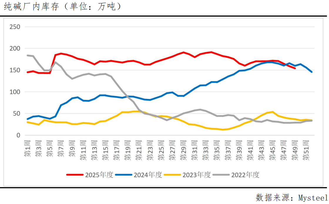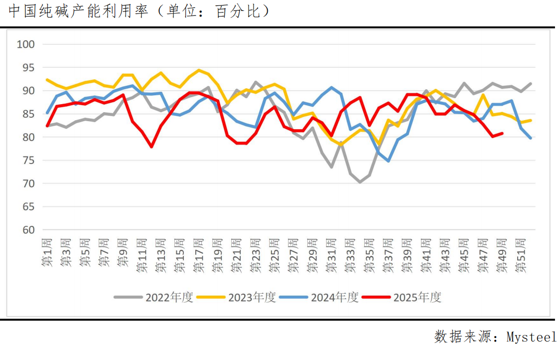 当前纯碱行业的根本问题在于产能过剩格局未变,且供应弹性居高不下。尽管经历了季节性检修,但行业开工率已迅速恢复至相对高位。根据Mysteel最新数据,截至12月初,国内纯碱综合产能利用率维持在80.74%,环比前一周小幅回升。纯碱基本面已是“明牌”,行业产能过剩、供应弹性高的问题依然存在,市场需要倒逼产能出清,才能实现供需再平衡。这意味着在出现明确的产能退出信号前,供应端的压力将持续悬于市场之上。