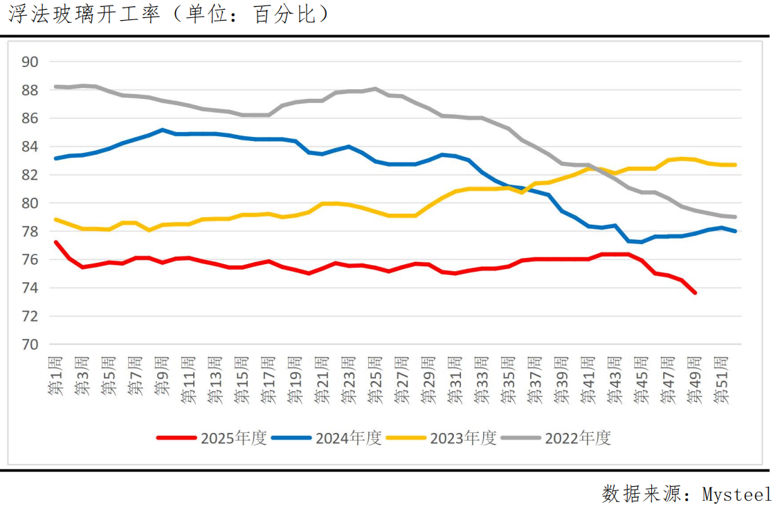 与稳定的供应相比,需求侧则表现乏力。下游主要领域表现分化但整体偏弱。纯碱最大的下游玻璃行业前景谨慎,市场对12月玻璃产线冷修增多的预期较强,重碱需求存在减量预期。光伏玻璃方面,虽在“反内卷”政策背景下,无序竞争有所遏制,但行业整体仍处弱势,在产产能稳中略降,对纯碱的刚需消费支撑有限。