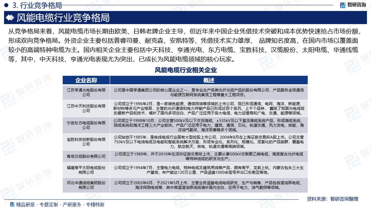 企业格局:从竞争格局来看,风能电缆市场长期由欧美、日韩老牌企业主导,但近年来中国企业凭借技术突破和成本优势快速抢占市场份额,形成双向竞争格局。外资企业主要包括普睿司曼、耐克森、安凯特等。国内相关企业主要包括中天科技、亨通光电、东方电缆、宝胜科技、汉缆股份、太阳电缆、华通线缆等,其中,中天科技、亨通光电表现尤为突出,已成长为风能电缆领域的核心玩家。