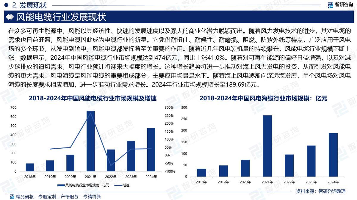 市场规模:随着近几年风电装机量的持续攀升,风能电缆行业规模不断上涨。数据显示,2024年中国风能电缆行业市场规模达到474亿元,同比上涨41.0%。随着对可再生能源的偏好日益增强,以及对减少碳排放的迫切需求,风电行业预计将迎来大幅度的增长。这种增长趋势将进一步推动对海上风力发电的投资,从而引发对风能电缆的更大需求。