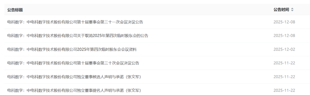 近日,中电科数字技术股份有限公司(以下简称“公司”)收到独立董事候选人张文军先生通知,由于其个人工作安排原因无法担任独立董事职务,经慎重考虑,取消关于选举张文军先生为公司第十届董事会独立董事的议案,并取消原定于2025年12月10日召开的公司2025年第四次临时股东会。
