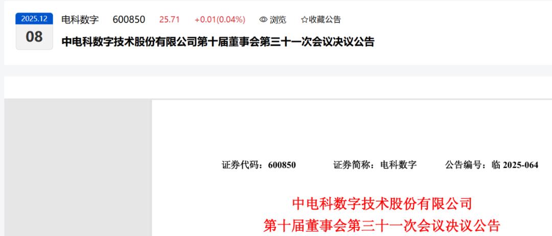 中电科数字技术股份有限公司(以下简称“公司”)第十届董事会第三十一次会议通知于2025年12月5日以电子邮件方式发出,会议于2025年12月7日以电子通信方式召开。经全体董事书面同意,豁免本次会议通知时间要求。本次会议应到董事9名,实到董事9名。本次会议的召开符合国家有关法律法规和公司章程的规定。