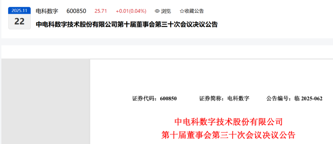 中电科数字技术股份有限公司(以下简称“公司”)第十届董事会第三十次会议通知于2025年11月19日以电子邮件方式发出,会议于2025年11月21日以电子通信方式召开。经全体董事书面同意,豁免本次会议通知时间要求。本次会议应到董事9名,实到董事9名。本次会议的召开符合国家有关法律法规和公司章程的规定。