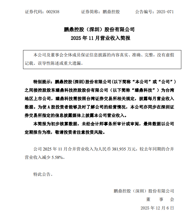 12月6日,PCB龙头企业鹏鼎控股发布月度经营数据。公告显示,公司2025年11月合并营业收入约为381,935万元,较去年同期的合并营业收入减少5.58%,出现短期业绩波动。