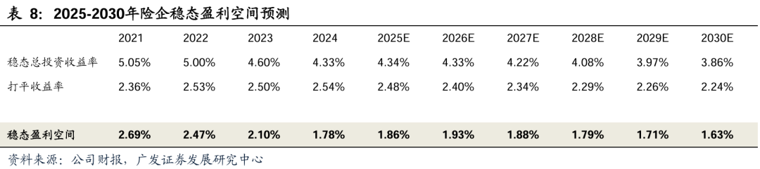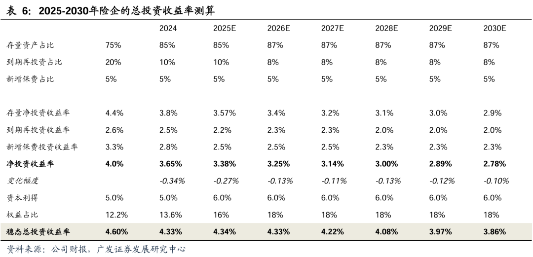 最后从净投资收益率到总投资收益率,一是公开市场权益占比从12%比例逐渐提升,假设2025年为16%,2027-2030年为18%;二是过去稳态资本利得假设为5%,由于增量资金持续入市,我们假设2025-2030年权益资本利得为6%,则稳态总投资收益率从2024年的4.3%保持相对稳定,但随着净投资收益率的下降而下滑至4%左右,2025-2030年稳态总投资收益率平均水平为4.1%。