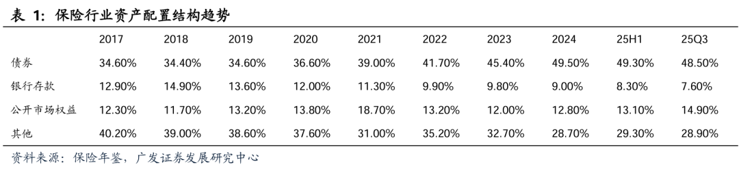 从保险行业资产配置结构看,25Q3债券占比为48.5%,环比24年末的49.5%下降了1个百分点,一改23-24年债券占比持续提升的趋势;而“股票+基金”的规模达到5.6万亿元,占行业总投资资产的比例为14.9%,环比提升了2.1个百分点,若考虑到前三季度沪深300指数上涨14%,若剔除按照沪深300指数的涨幅计算的价值增长,则净增加的规模达到8450亿元,相应监管持续引导长期资金入市。
