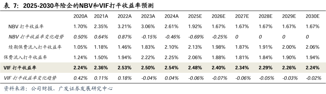 从存量的综合负债成本看,随着2023年及以后较低预定利率保单的续期保费持续流入,“VIF打平收益率”已经趋势走平,我们认为未来“VIF打平收益率”有望下降。2019-2022年,受产品结构逐渐转向传统型产品,叠加行业下行周期保险公司加大费用投入等综合因素影响,保险公司“VIF打平收益率”整体呈现上行趋势,但随着2023-2024年新增保单综合负债成本的下降等,“VIF打平收益率”呈现出企稳的趋势。