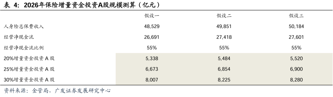 参考上市寿险公司经营净现金流入占保费收入的比例55%的水平,若按照20%、25%、30%投资A股的比例测算,则2026年寿险资金入市的规模预计约为5000-8000亿元的水平。