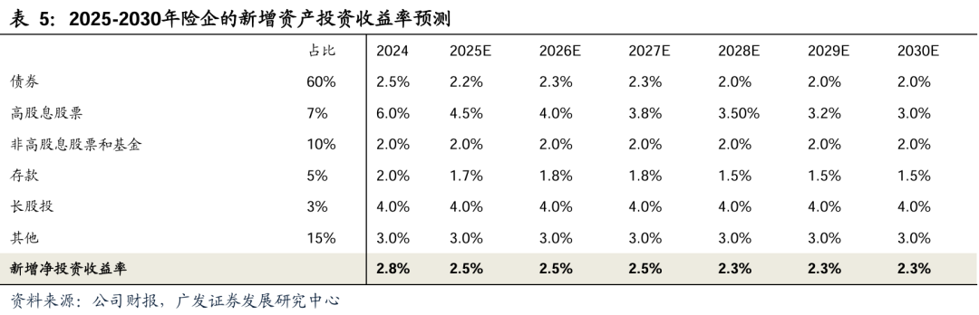 再是,高股息股票参考当前负债成本以及主要的银行股息率等水平,假设2025年为4.5%,2026-2030年依次下降;其他股票和基金参考沪深300指数的股息率水平,但剔除到高股息等资产,假设为2%,存款参考10年期国债收益率回报,其他则按照3%的股息及利息回报。