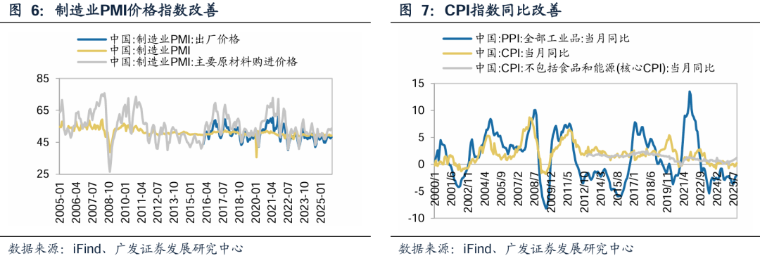PMI价格指数回升,核心CPI指数环比改善,反内卷政策或初见成效。2025 年 11 月我国 PMI 指数为49.2%,环比+0.2pct,PMI 出厂价格指数和主要原材料购进价格指数分别环比+0.7pct和+1.1pct至48.2%和53.6%。其次,2025 年 10 月 PPI 指数环比+ 0.1pct,CPI 指数当月同环比+0.2pct,反内卷政策或初见成效。
