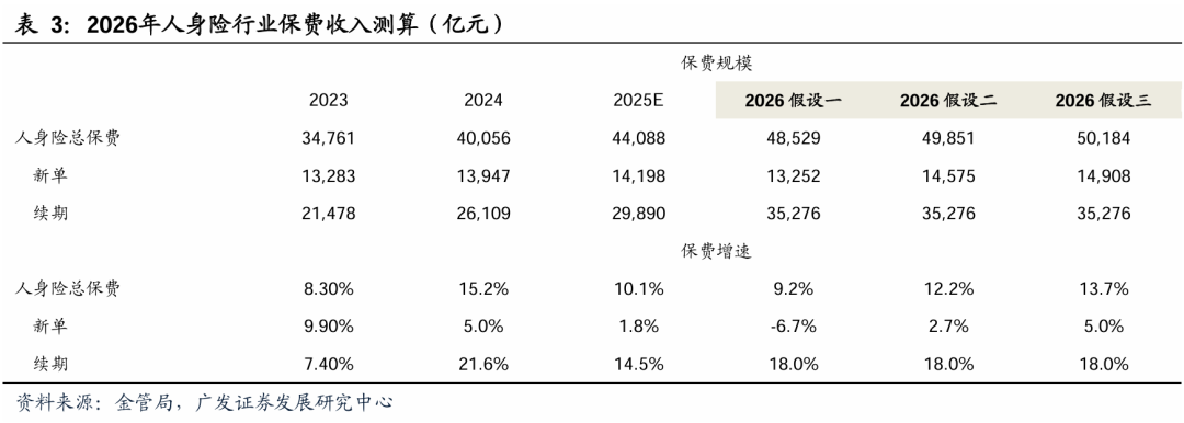2025年前三季度人身险公司总保费为3.84万亿元,同比+10.2%,考虑到四季度整体保持相对平稳,假设2025全年新单保费增速为1.8%,总保费增速为10.1%。展望2026年,考虑到当前居民的储蓄意愿依然较高,定期存款利率相对较低,虽然行业整体朝分红险转型,但受益于2024-2025年行业整体投资收益率的上行等,1.75%的预定利率+浮动型收益有望明显高于定期存款利率,另外考虑2024-2025年受益于旧产品的集中退市造成较高的基数,我们审慎、中性、乐观假设2026年新单保费增速分别为-6.7%、2.7%、+5%,而续期保费增速假设为过去三年续期保费增速的平均值(18%),因此预测2026年总保费增速分别为9.2%、12.2%、13.7%,总保费规模分别为4.85万亿元、4.99万亿元、5.02万亿元。
