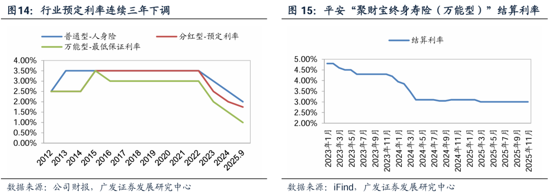 二是从存量维度,监管窗口指导浮动型产品实际利率水平。寿险产品分为传统型寿险和浮动型寿险,后者主要包括分红型产品和万能型产品,不仅有最低保证利率(预定利率),还有浮动收益部分,如分红型产品预定利率为2.5%,但保单持有人享有参与分配分红险业务可分配盈余的权利,保单持有人的实际回报一般高于保证利率。且过去保险公司为了保单的销售,分红险的实际回报率以及万能险的结算利率远高于保证利率,导致浮动产品实际分红水平相对较高。为了防止利差损风险,监管反内卷式限高浮动型产品的收益率水平。据中国证券报的报道,2024年3月份监管部门对部分人身险公司进行窗口指导,要求大部分中小公司的万能险结算利率水平不超过3.3%,大型保险公司万能险结算利率不得超过3.1%,且分红险的实际分红水平也要求降至与万能险结算利率同等水平。2025年6月份监管再次下发《关于分红险分红水平监管的函》,再次规范分红实现率等。