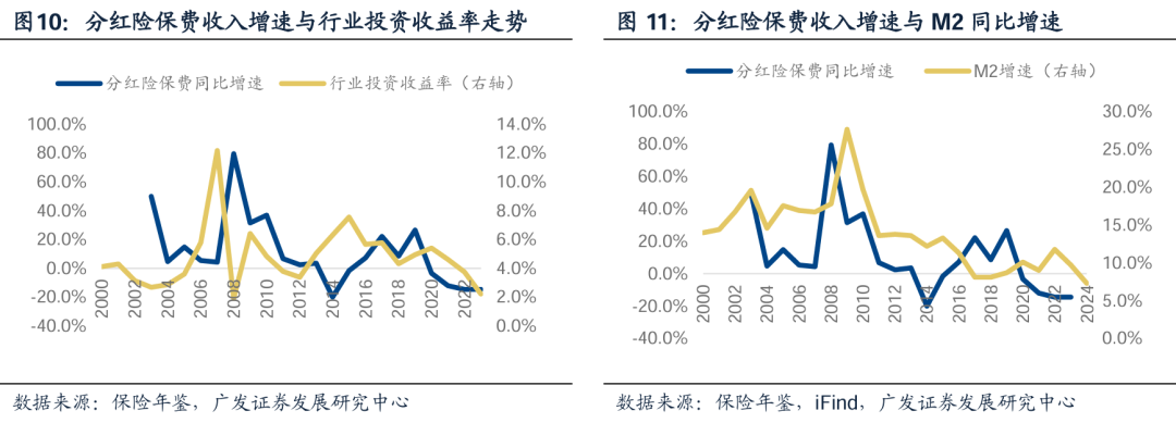 通过对分红险保费收入的分析来看,影响分红险销售的影响因素包括行业投资收益率、M2增速,而与代理人规模相关程度较低。首先,分红险的浮动收益部分与账户投资收益率息息相关,账户可分配盈余中70%的部分属于投保人,因此分红险保费收入增速与投资收益率挂钩,因此若前一年投资收益率提升,保单年度的分红实现率较高,有利于下一年产品的销售,如2007年权益市场大牛市,2008年分红险保费增速79.5%,较2007年的增速(4.3%)大幅扩大;2009年总投资收益率6.4%,2010年分红险保费增速36.9%,维持高速增长态势;2015-2017年行业总投资收益率保持较高水平,分红险保费增速由2015年的-1.5%扩大至2016年的7.3%,2017年继续扩大至22.1%。其次,分红险作为理财类产品,存在较强的储蓄功能,因此与货币供应量有关,因此在宽松的货币政策下,居民尤其是高净值客户的现金流相对充裕,将加强对储蓄产品的需求,并且基于储蓄的投资需求不会存在天花板的局限。反之在央行收紧货币的背景下,居民现金流紧张,将会降低对大额分红险等储蓄型产品的需求,不仅是新单销售,也会影响到大额保单的续保情况。如2005年M2同比增速17.6%,增速扩大,当年分红险保费收入增速14.8%,较2004年的4.7%明显扩大;2009年受益于量化宽松政策,M2增速大幅扩张,当年分红险保费收入增速31.6%,在2008年增长79.5%的高基数下继续大幅增长。