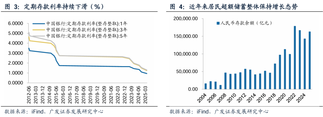 存款利率呈现下行趋势,居民储蓄有望向权益搬家。自2018年以来,宏观经济增速放缓、地缘政治频发、风险事件发生等等降低了我国居民的风险偏好,我国居民储蓄余额呈大幅增长态势,截至2025年10月居民储蓄余额达162.6万亿元。2008-2017年期间,每年居民储蓄余额增长4-6万亿元,而近年来达到14-16万亿元。伴随经济由高速增长转变为高质量发展的转型,银行存款利率也呈现不断下行态势。考虑当前稳增长政策持续发力下宏观经济稳中有升,股市赚钱效应和稳定性提升,居民储蓄向权益市场迁移有望加速。