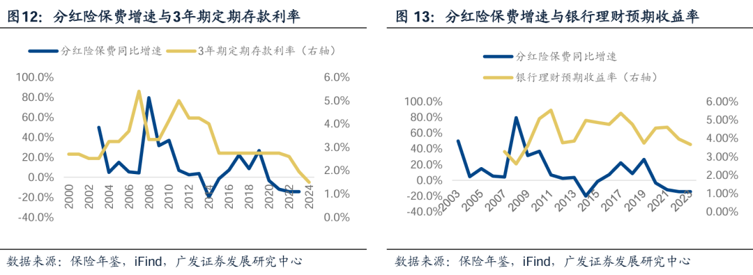 再是分红险作为理财类产品,与竞品类产品呈现一定程度的此消彼长趋势。分红险具有储蓄功能,与同类理财型产品存在一定的竞争关系,因此竞品收益率的变动不可避免地会影响到分红险产品的竞争力,如2005年银行理财收益率下行,推动分红险保费收入增速由2004年的4.7%扩大至2005年的14.8%,2008年3年期定期存款利率由5.4%降到3.3%,叠加2007年投资收益率大幅提升推动分红实现率较高,当年分红险保费增速大增79.5%,2009年银行理财收益率继续下滑,分红险保单维持较高增长。