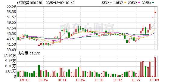 *ST铖昌盘中涨停,已连收3个涨停板,截至9:32,该股报54.15元,换手率2.31%,成交量469.54万股,成交金额2.51亿元,连续涨停期间,该股累计上涨15.78%,累计换手率为6.78%。最新A股总市值达111.61亿元,A股流通市值110.20亿元。