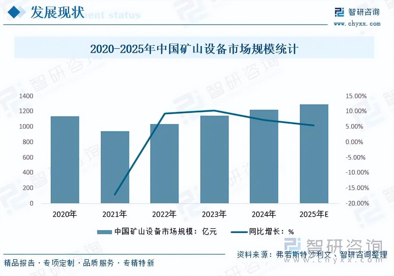 中国是全球矿山设备重要市场之一。近年来,随着国内矿业技术的不断提高,“绿色矿山”和“智能矿山”战略的深入推进,矿山开采深度越来越深,对矿山设备的需求也将不断增加。据统计,2024年中国矿山设备市场规模1230亿元,预计2025年有望达到1297亿元。