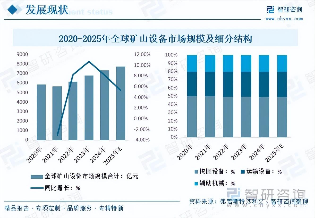 矿山设备是矿山开采作业中必不可少的现代化工具之一。矿产资源作为一种重要的基础能源,在社会经济发展中起着举足轻重的作用。近年来,社会经济的飞速发展,对能源的需求日益增大,促使矿产资源得到不断开发和挖掘,全球矿山设备安装市场逐渐发展壮大。2024年全球矿山设备市场规模增长至7368亿元,其中,挖掘设备占49.14%,运输设备占30.72%,辅助机械占20.14%;预计2025年全球矿山设备市场规模将增长至7759亿元。其中,挖掘设备占48.84%,运输设备占31.14%,辅助机械占20.02%。