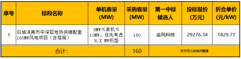 东方风力发电网讯:12月9日,中城汇能招投平台发布《洮南市中深层地热供暖示范项目配套160MW风电项目风力发电机组及其附属设备(含塔筒)采购(二次)》中标候选人公示,总规模容量:160MW,公告显示,金风科技预中标,投标报价29276.34万元。