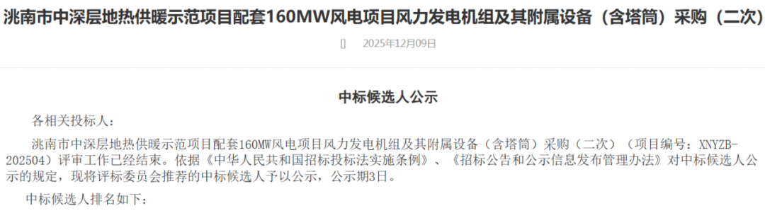 洮南市中深层地热供暖示范项目配套160MW风电项目风力发电机组及其附属设备(含塔筒)采购(二次)中标候选人公示