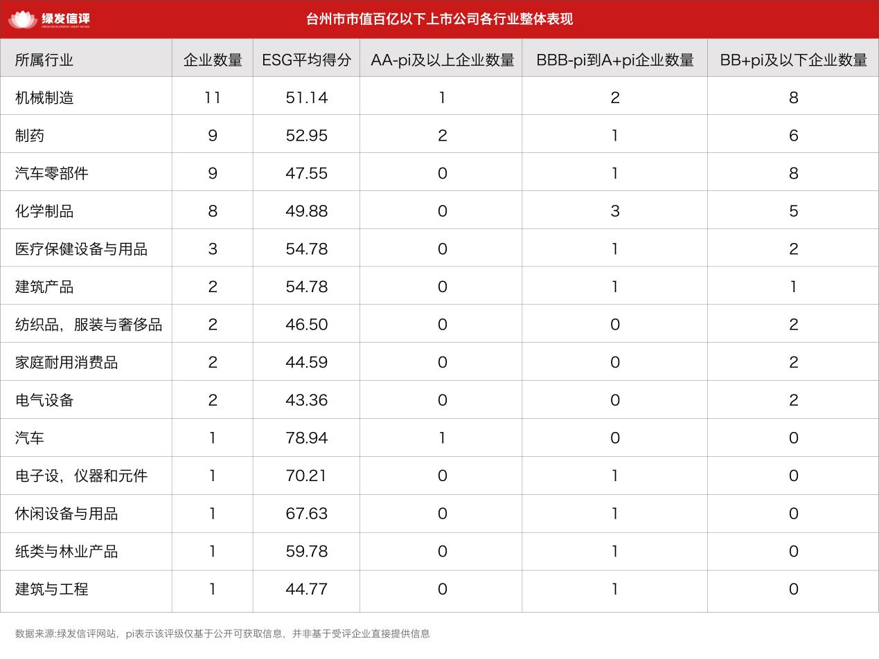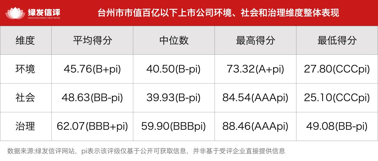 中国财富网讯 近日,海南绿色发展信用评级有限公司(以下简称“绿发信评”)在其网站发布A股上市公司ESG主动评级结果。评级结果显示,浙江省台州市市值(截至三季度末)在100亿元以下的53家上市公司ESG平均分为51.51分,显著低于市值在100亿元以上企业66.77分的平均分,与台州市头部上市公司相比,存在明显差距。