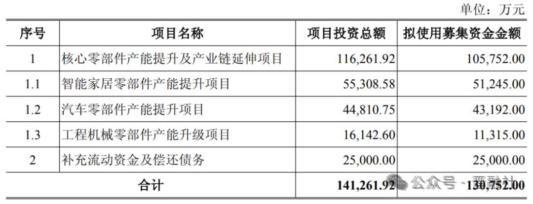 核心零部件产能提升及产业链延伸项目,总投资规模达到11.63亿元。其中,两个子项目与此次经营范围新增的智能制造、汽车零部件相关。智能家居零部件产能提升项目,投资总额达5.53亿元,汽车零部件产能提升项目投资额达4.48亿元,两项目合计投资10.01亿元。