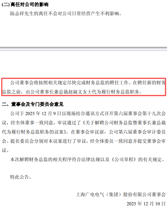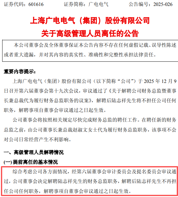 2025年12月10日,上交所主板上市公司广电电气(601616.SH)发布了《关于高级管理人员离任的公告》。公告显示,综合考虑公司各方面情况,公司董事会决定解聘陆志祥先生的财务总监职务,解聘后陆志祥先生不再担任公司任何职务。