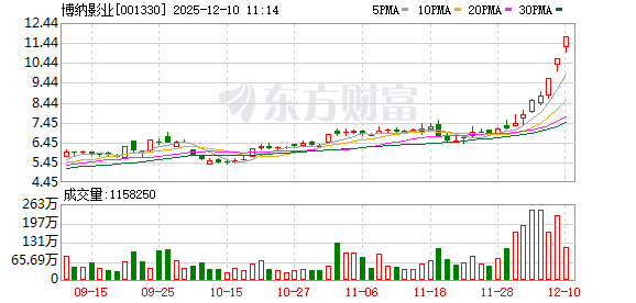 博纳影业盘中涨停,已连收3个涨停板,截至9:47,该股报11.72元,换手率9.63%,成交量1.12亿股,成交金额12.81亿元,涨停板封单金额为3.10亿元。连续涨停期间,该股累计上涨33.18%,累计换手率为43.33%。最新A股总市值达161.09亿元,A股流通市值136.29亿元。