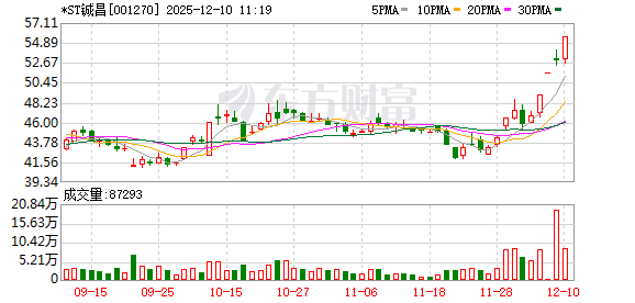 *ST铖昌再度涨停,4个交易日内录得3个涨停,累计涨幅为18.71%,累计换手率为16.24%。截至9:47,该股今日成交量460.12万股,成交金额2.50亿元,换手率2.26%。最新A股总市值达114.43亿元,A股流通市值112.98亿元。