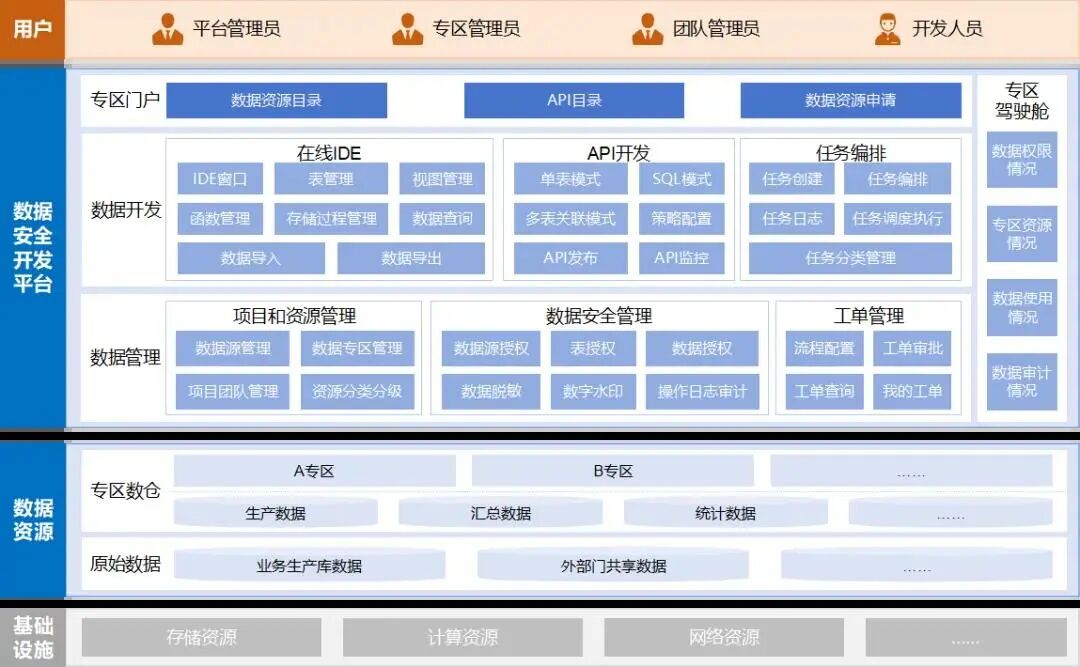 平台以存储、计算、网络等基础设施为支撑,融合业务生产库数据和外部门共享数据,提供从数据管理、数据开发、数据应用到数据可视化监控的全流程一站式数据安全开发解决方案。