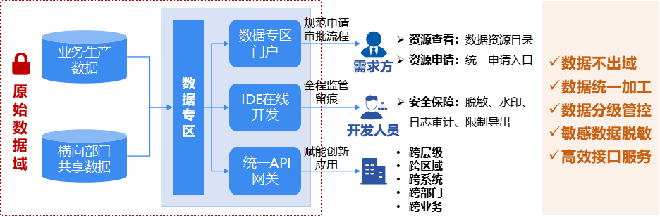 依托数据安全开发平台,可将业务生产数据、横向部门共享数据等全量汇聚到统一的数据专区。各部门、各地区按需提交数据使用申请,经数据管理部门审批,对敏感数据脱敏、加密、加水印后,精准授予使用权限。需求单位在专区内完成统一的数据加工与分析,操作过程可监控、可追溯,真正实现“原始数据不出域、数据可用不可见”,保障数据安全与合规。