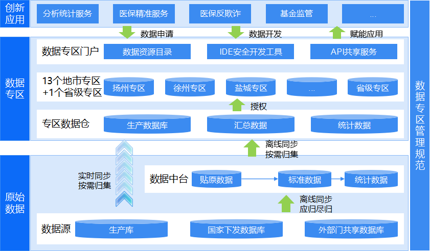 依托江苏省医疗保障信息平台大数据应用体系建设成果,深度融合省级平台统一规范与地方业务灵活需求,以“安全、可控、创新、共享”为核心原则,建设集约高效、智能协同的数据专区管理平台,全面赋能数据治理与应用,助力构建更安全、更智能、更全面的医保数据赋能“新生态”。