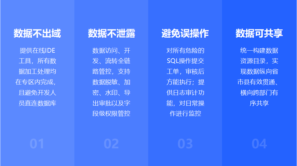 数据管理方面,平台提供项目和资源管理、数据安全管理、工单管理等功能,确保数据资源合理分配、数据使用安全合规;数据开发方面,集成任务编排、在线IDE、API开发等在线安全开发工具,支持数据高效协同开发;数据应用方面,面向使用者提供完善的资源目录和API目录,支持数据预览和数据资源申请,并通过多级审批机制,确保数据安全可靠、高效共享。此外,平台建设专区驾驶舱,帮助管理者以全局视角,实时掌握数据运行状态,及时发现潜在风险,实现数据安全闭环管理。