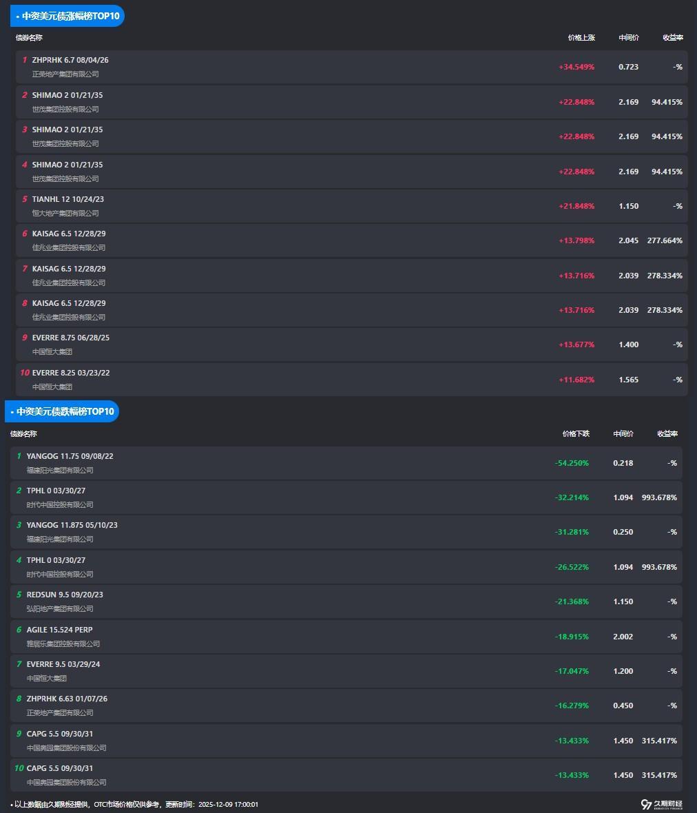 12月9日,中资美元债涨跌幅榜TOP10如下: