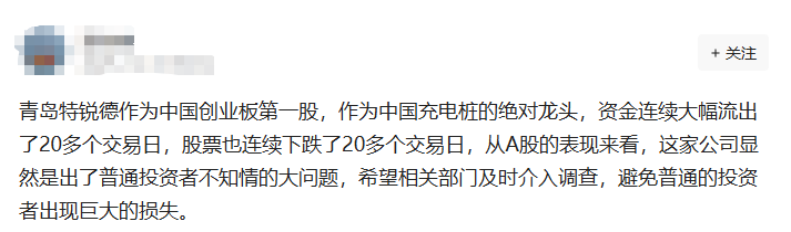 12月10日早间,有投资者在第三方平台反映,青岛特锐德作为中国创业板第一股,作为中国充电桩的绝对龙头,资金连续大幅流出了20多个交易日,股票也连续下跌了20多个交易日。该投资者质疑“这家公司显然是出了普通投资者不知情的大问题”。
