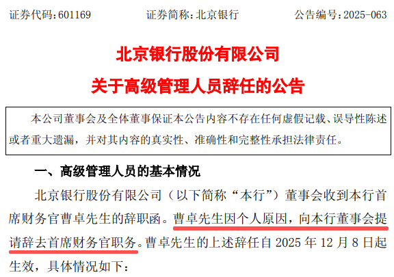 2025年12月10日,上交所主板上市公司北京银行(601169.SH)发布了《关于高级管理人员辞任的公告》。公告显示,北京银行董事会收到本行首席财务官曹卓先生的辞职函。曹卓先生因个人原因,提请辞去首席财务官职务。