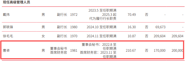 曹卓先生,北京银行董事会秘书、首席财务官。中国人民大学经济学硕士,高级会计师。