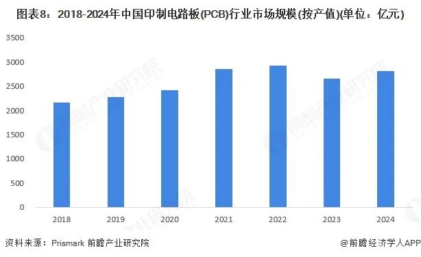印制电路板(PCB)在下游领域的应用十分广泛,涉及通讯电子、计算机、消费电子、汽车电子、工业控制、医疗器械、国防及航空航天等领域,近年来,随着我国工业的快速发展,以及新兴领域的需求增加,印制电路板(PCB)行业也迎来了新的发展机遇。2018-2023年,我国印制电路板(PCB)行业市场规模从2163.9亿元增长至2662.9亿元,复合增长率为4.2%。结合历年统计数据及市场变动情况,初步统计,2024年我国印制电路板(PCB)行业市场规模约2806亿元,同比增长5.4%。