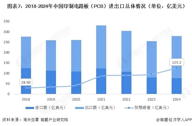 我国印制电路板(PCB)行业长期处于贸易顺差状态,根据海关总署的数据,2018-2024年,我国印制电路板(PCB)行业贸易顺差整体呈扩大趋势,2024年贸易顺差达到125.2亿美元,同比增长31.2%。